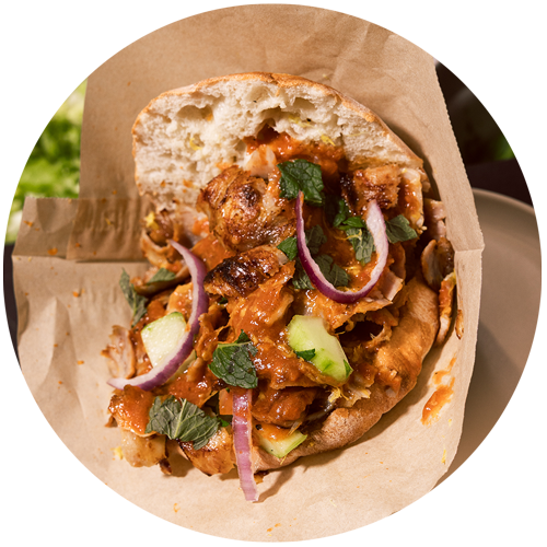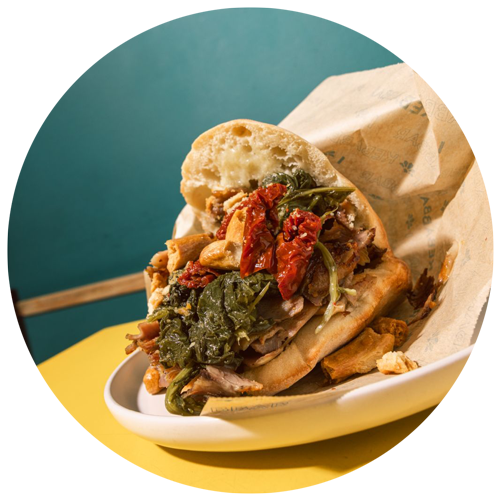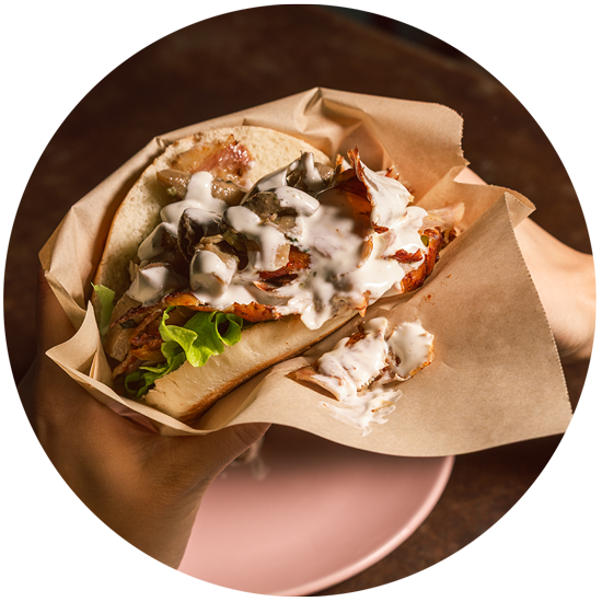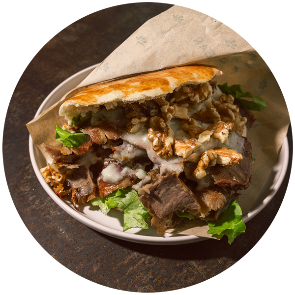 Pane pogaca, formaggio filante, insalata gentile, cipolla caramellata al vino bianco, funghi trifolati, salsa allo yogurt.