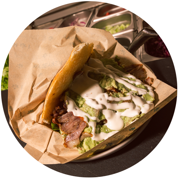 pane pogaca, formaggio filante, insalata gentile, crema di avocado, salsa allo yogurt