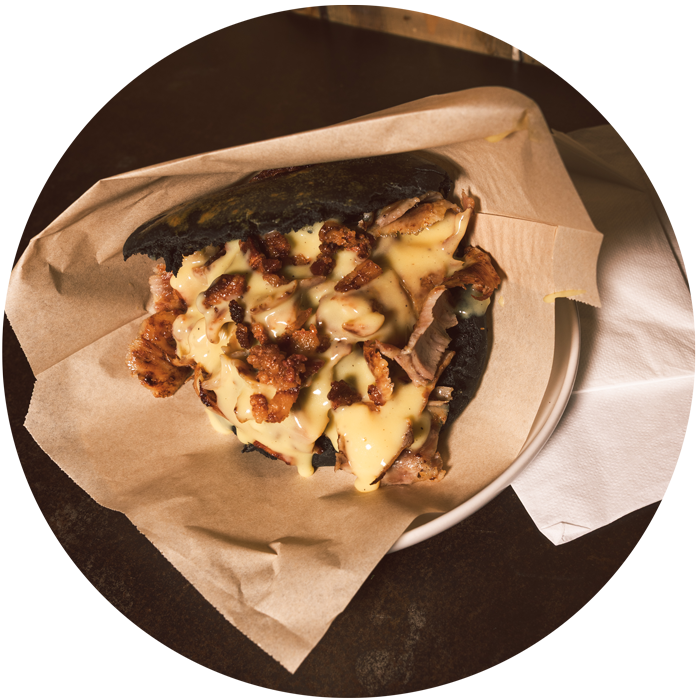 pane pogaca al carbone vegetale, crema alla carbonara, guanciale croccante